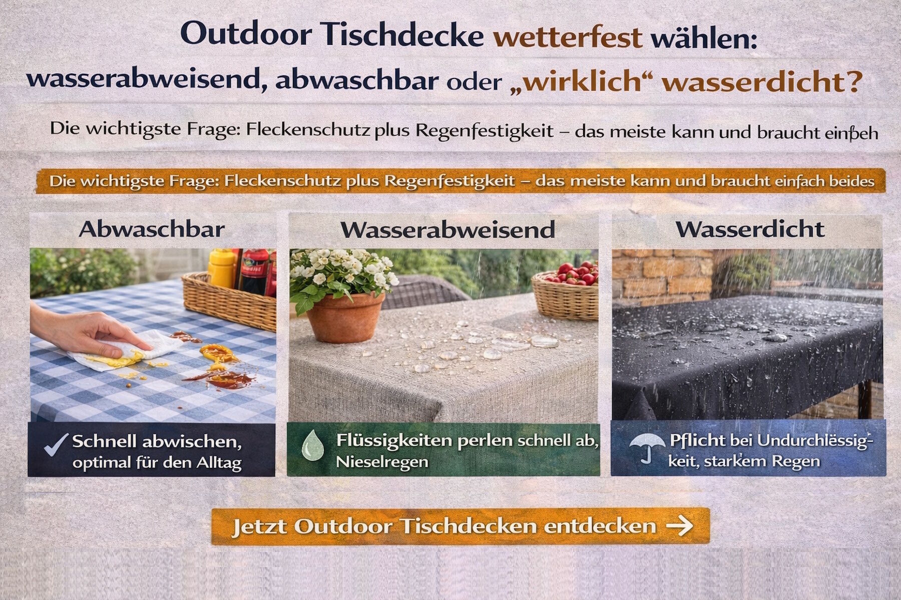 Merksatz: Für die meisten Suchanfragen wie „tischdecke für gartentisch wetterfest“ oder „tischdecke wasserabweisend“ ist eine abwaschbare, beschichtete Outdoor Tischdecke die pragmatisch beste Lösung.